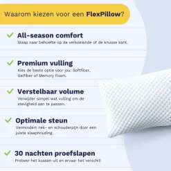 Het FlexPillow hoofdkussen volgt de contouren van je hoofd en nek en verdeelt de druk gelijkmatig. Dit zorgt voor een gezonde slaaphouding en helpt klachten in nek en schouders te verlichten. Het kussen is speciaal ontwikkeld om je ruggengraat in de juiste positie te houden, zodat je uitgerust en pijnvrij wakker wordt. Perfect voor iedereen die zoekt naar een orthopedisch en ergonomisch hoofdkussen.