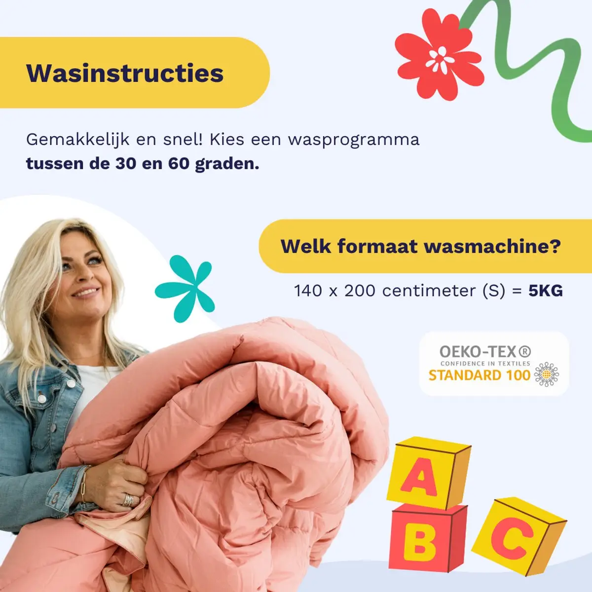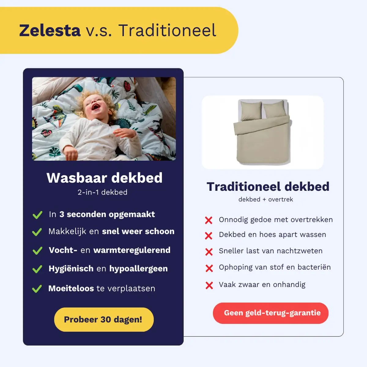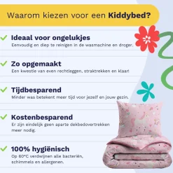 Met het Zelesta Kiddybed halveer je de tijd die je besteedt aan beddengoed verschonen. Geen losse hoezen meer, geen zware dekens sjouwen – gewoon in de wasmachine en klaar. De lichtgewicht vulling zorgt voor optimale temperatuurregulatie en voorkomt nachtzweten, zodat je kind elke ochtend uitgerust en vrolijk opstaat.