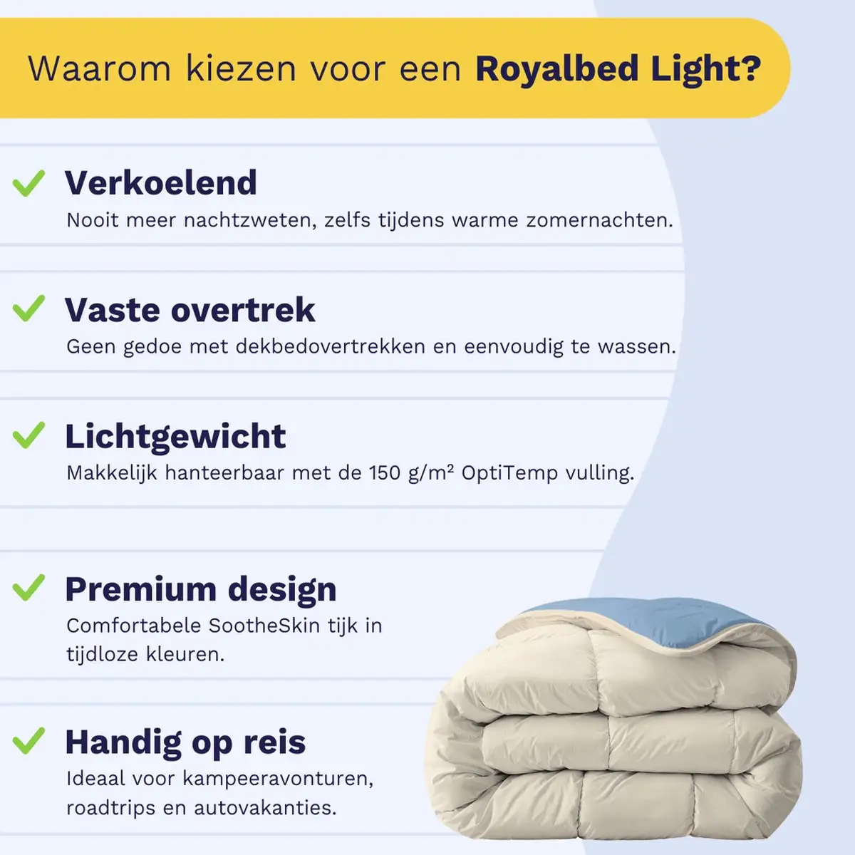 Slaap frisser, schoner en gezonder met het Royalbed Light. De hypoallergene vulling voorkomt ophoping van huisstofmijt, bacteriën en schimmels, terwijl de ademende structuur zorgt voor temperatuurregulatie. Geen plakkerige nachten meer, maar een frisse slaapervaring – het hele seizoen door.