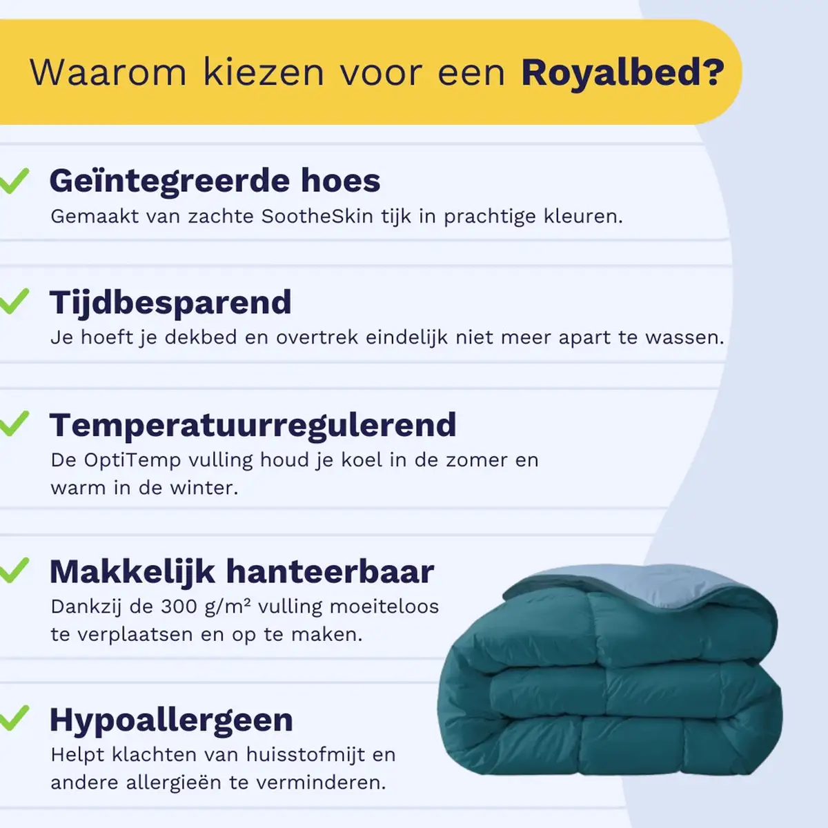 Het Royalbed dekbed is volledig machinewasbaar en droogt verrassend snel. Zo heb je altijd een fris, schoon en hygiënisch slaapklimaat zonder gedoe. Vrij van huisstofmijt, bacteriën en nare geurtjes – en dankzij de slimme vulling blijft het dekbed koel in de zomer en behaaglijk warm in de winter.