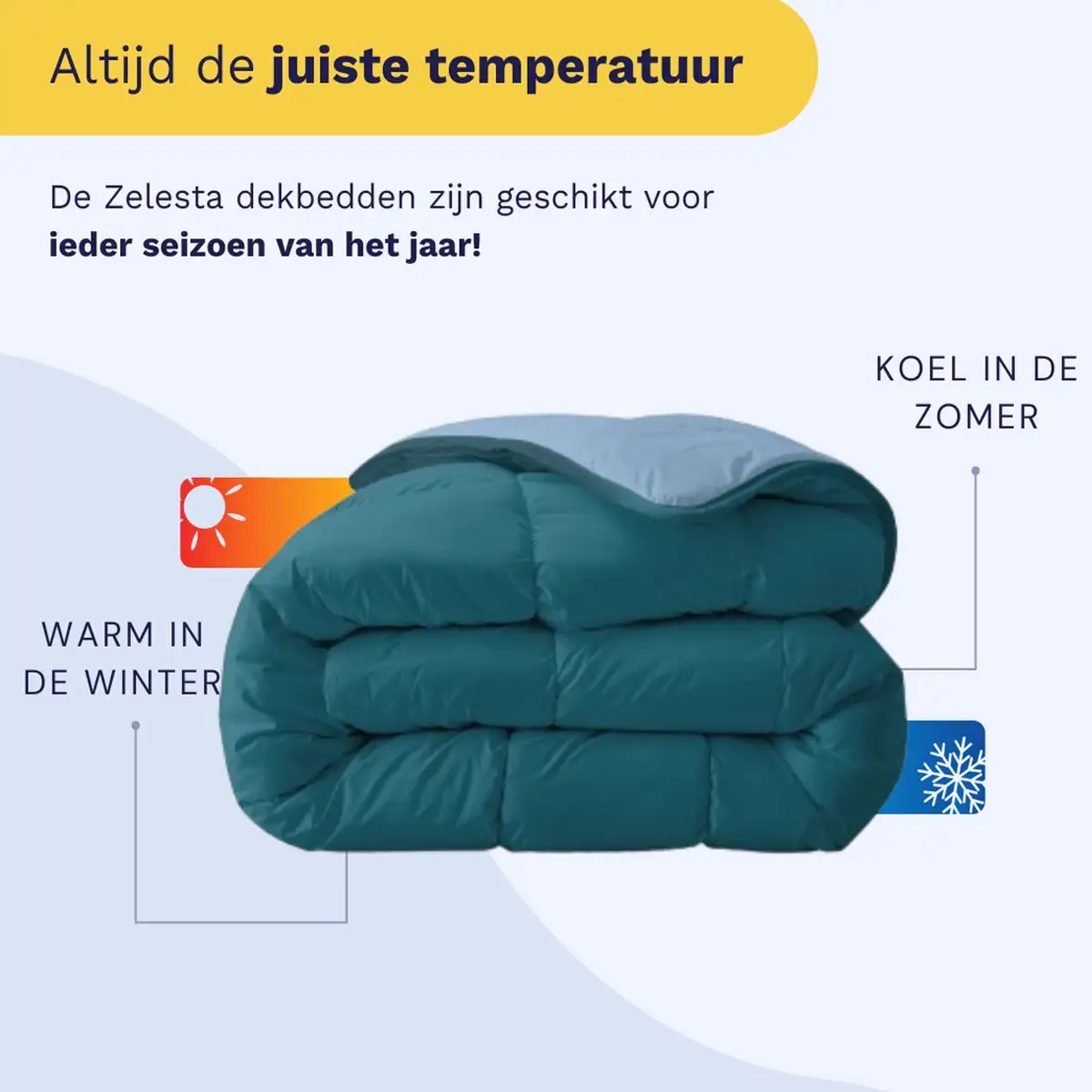 Dekbed is saai, te glad, te warmMeerdere malen wakker omdat het dekbed te warm is en op de grond ligt doordat hij van bed afglijdt.Zowel mijn man als ik vinden het een slecht dekbed.Wij gaan weer terug naar dekbedden mèt overtrek.Voor ons geen Zelesta.