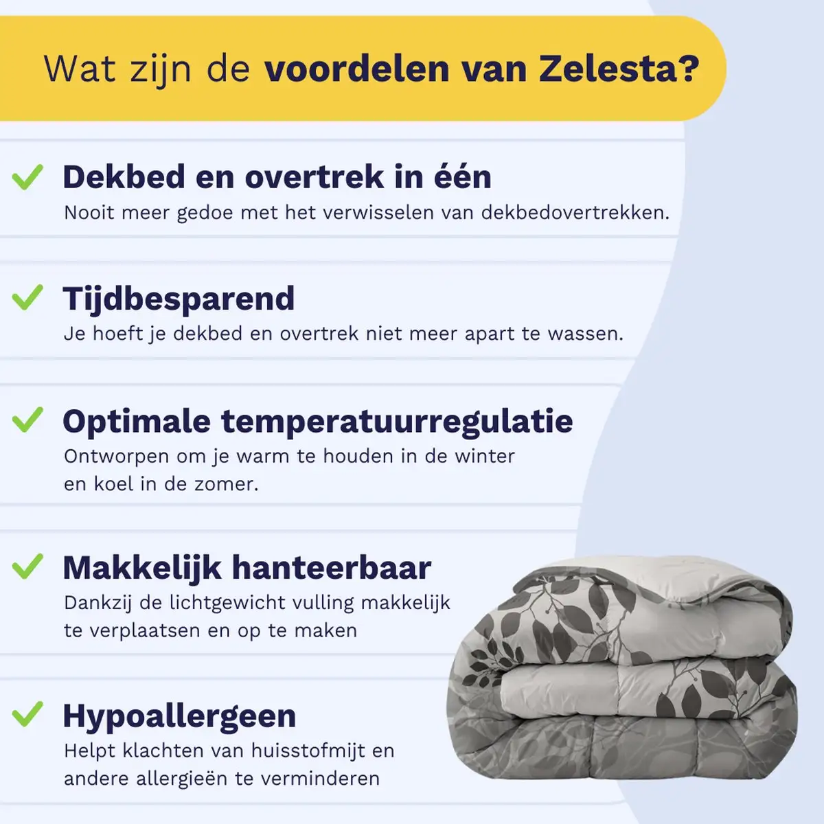Heel blij met mijn dekbed: je bed is snel opgemaakt, de stof is heel mooi, zo wat satijn, en voelt fijn aan. In de koude dagen doe ik er wel nog een fleece deken bij maar dat deed ik ook al bij mijn gewone dekbed omdat ik niet hield van het gedoe met winter- en zomerdekbedden. Ook goed dat Zelesta achteraf nog informatie stuurt hoe je je dekbed het best kunt onderhouden.