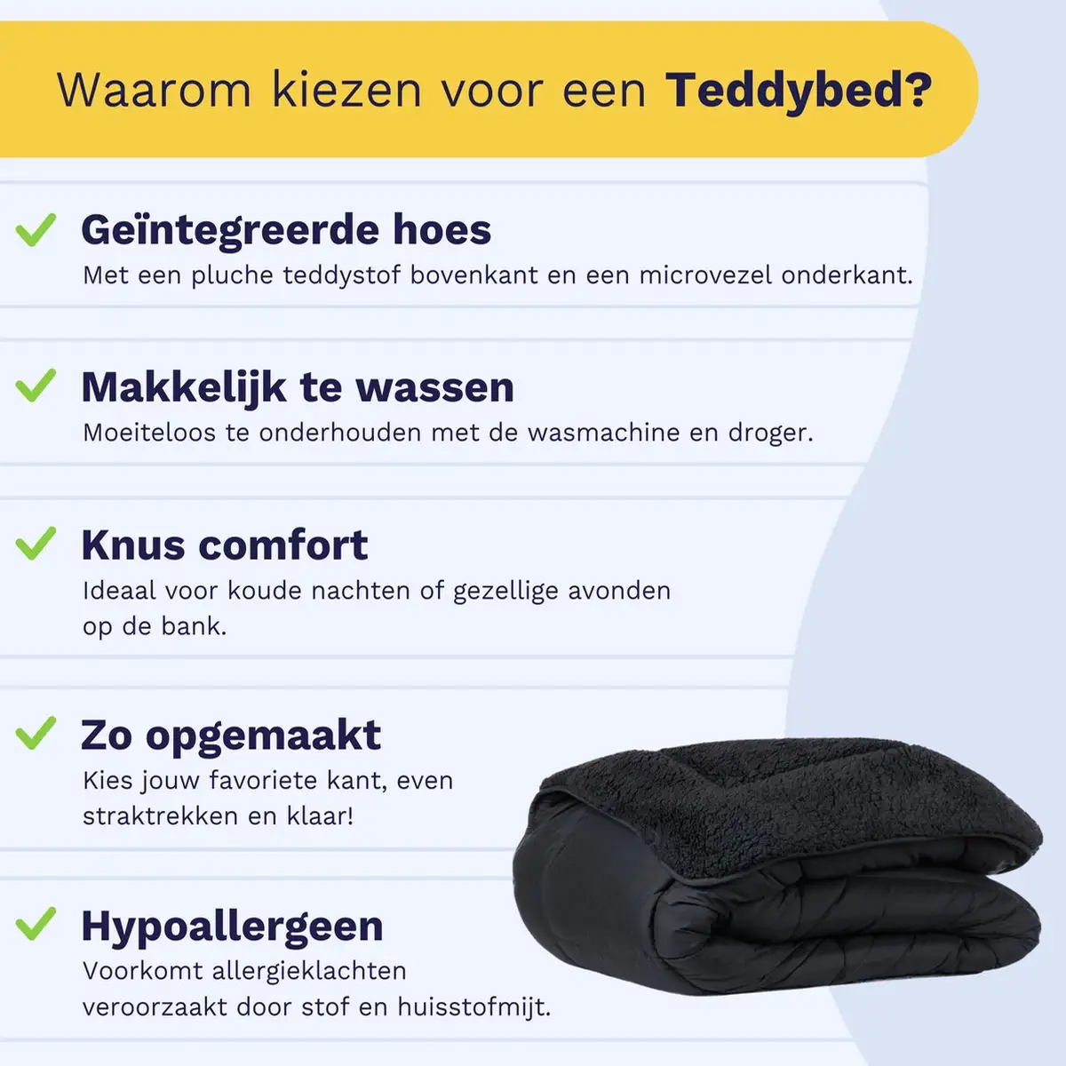 Het Teddybed dekbedovertrek is volledig wasbaar en droogt razendsnel, zowel in de buitenlucht als in de droger. Hierdoor slaap je altijd onder een 100% schoon dekbed, vrij van huisstofmijt, bacteriën en schimmels. De hypoallergene en antibacteriële eigenschappen maken dit dekbed ideaal voor een gezonde slaapomgeving. Dankzij de slimme vulling blijft de temperatuur perfect gereguleerd – warm in de winter, comfortabel in de tussenseizoenen. Zo combineer je frisheid, gemak en ultiem comfort in één.