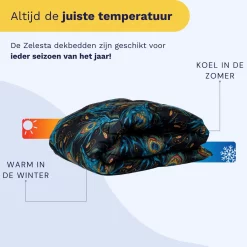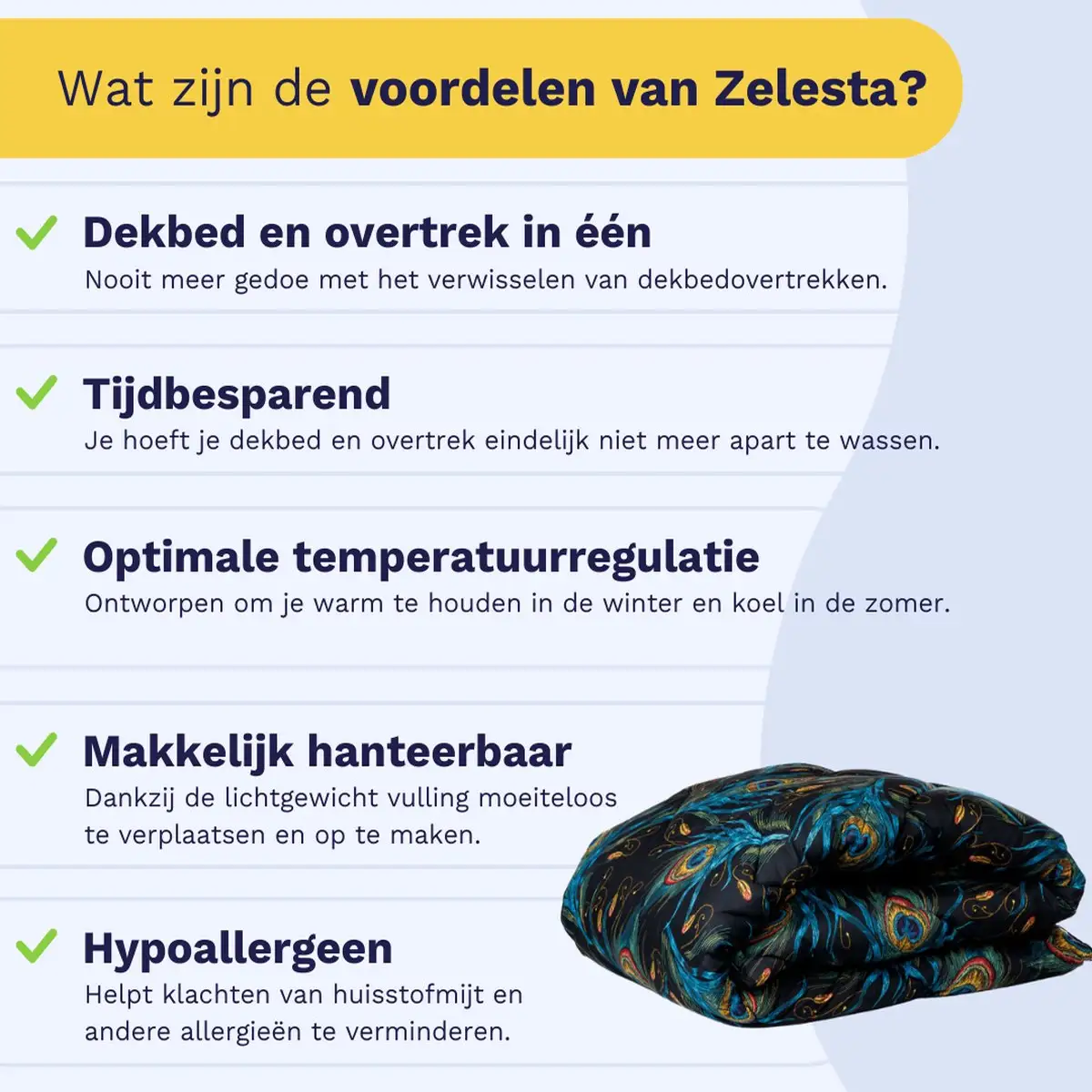 Geniet van luxe én gemak met het Zelesta Wonderbed Peacock Feathers 240x200cm. Wasbaar hoesloos dekbed met print, hypoallergeen en all-season comfort. Bestel nu!